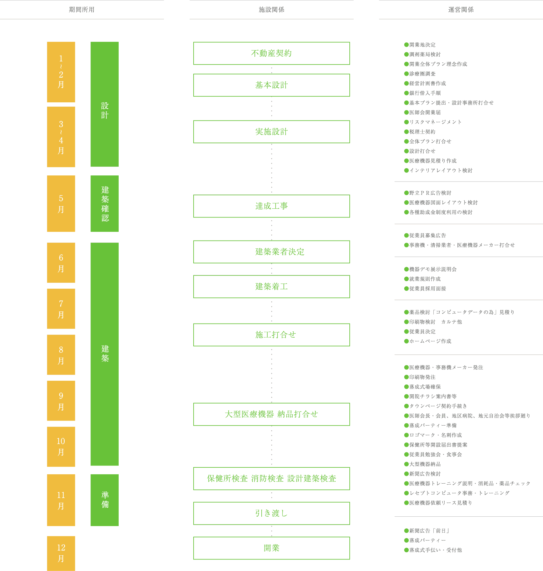 全体の流れをわかりやすくしたものが右のプロセスです。わたくしたちは 最初の段階から開業までお客様と密にプランをたてサポートし、実行することで個々の目的に応じたクリニックを共に開業していきます。
